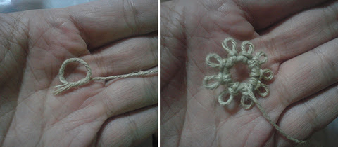 | おなじく紐は1本しか使わないんだけど、最初のワッカを紐の中央に作るというもの。 |